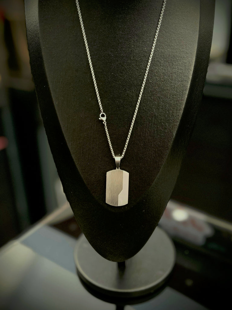 Optez pour un style sobre et raffiné avec cette chaîne argentée accompagnée d’une plaque militaire argentée au design unique, marquée d’un trait central. Un bijou moderne et masculin qui allie simplicité et caractère.