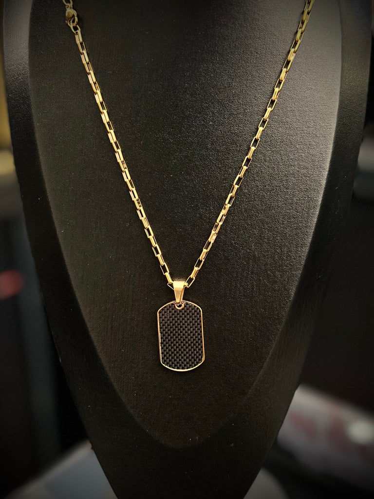 Affirmez votre style avec cette chaîne dorée accompagnée d’une plaque militaire unique, au design carbone noir et doré. Un bijou moderne qui mélange élégance, robustesse et caractère, parfait pour ceux qui veulent se démarquer.